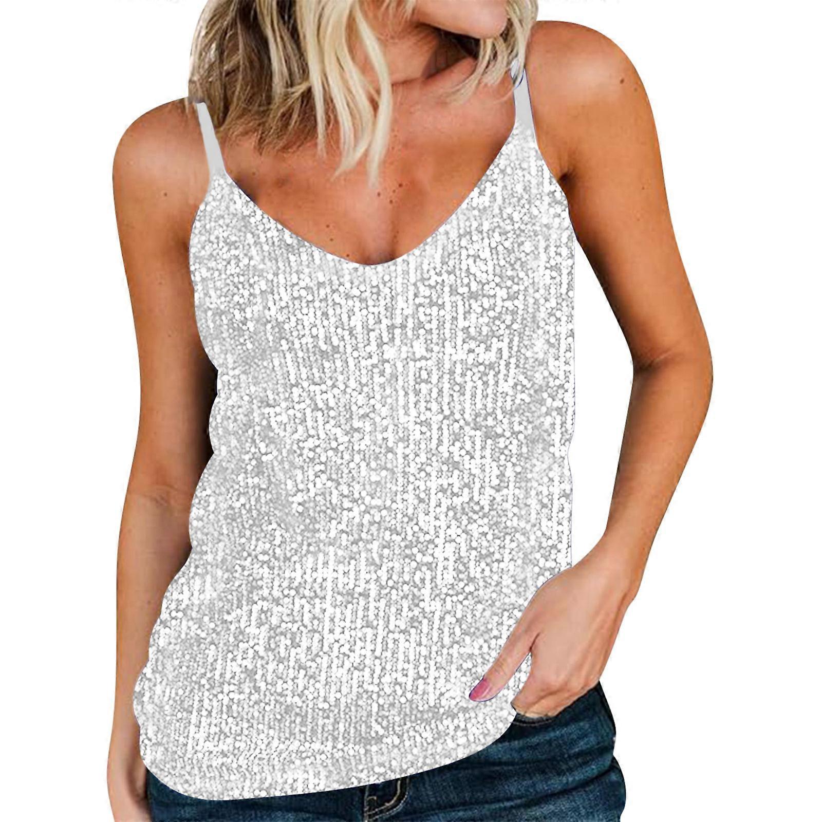 Sequins Tops For Women V Neck Sparkles Shimmer Glitter Party Camisole Sparkly Club Night Disco Concert Outfits Silver XL