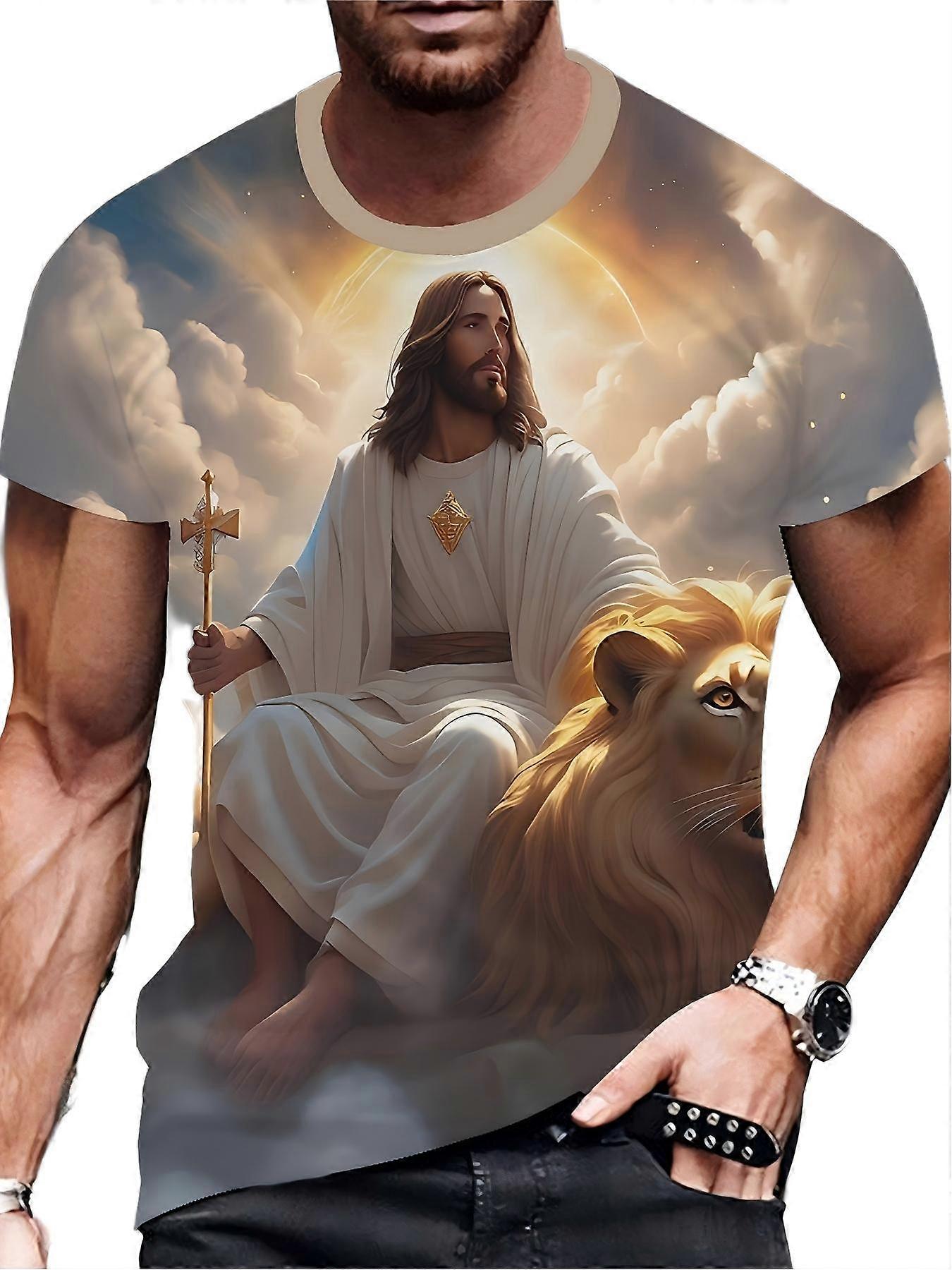 Men's Stylized Figure & Lion Graphic T-Shirt Warm Tone Art Print Tee Unique Casual Top