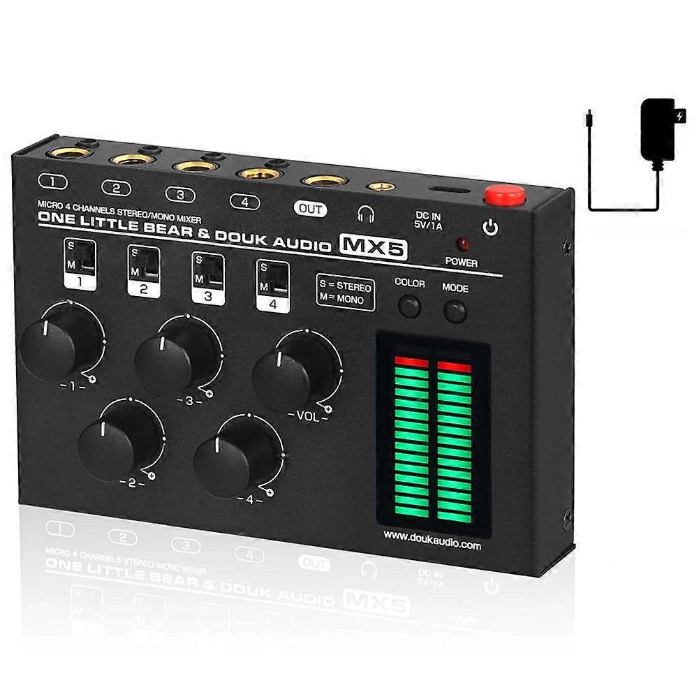 Versatile 4-Channel Mixing:The Douk Audio MX5 is a compact 4-channel audio mixer designed for flexible mono/stereo applications. It is ideal for combining multiple audio sources such as instruments, media players, computers and recording devices into one clean, controllable output for club, studio and home use. Ultra Low-Noise Line Mixer Design:Engineered with high-quality components and optimized circuits, this ultra low-noise line mixer delivers clear, transparent sound with minimal hiss and distortion. It is suitable for demanding audio environments where sound quality and stability are critical. Mono / Stereo Flexible Configuration:The MX5 supports both mono and stereo operation, giving you the freedom to adapt to different setups. Whether you need a simple mono summing mixer for live performance or a stereo line mixer for recording and playback, this unit can easily meet your needs. 6.35mm & 3.5mm Input / Output Interfaces:Equipped with both 6.35mm (1/4 inch) and 3.5mm (1/8 inch) jacks, the mixer is highly compatible with professional gear and consumer devices. Connect guitars, keyboards, mixers, audio interfaces, smartphones, tablets, laptops and other equipment without additional adapters. LED Level Meter for Visual Monitoring:A built-in LED level meter provides clear, real-time visual indication of signal levels. This helps you monitor volume, avoid clipping and adjust gain quickly, making it easier to achieve a balanced and professional mix in club, studio or home recording environments. Friendly Reminder: 1. The 3.5mm headphone jack output takes priority. If a 3.5mm jack is connected, the 6.35mm OUT interface will be automatically disconnected. 2. The MX5 only supports standard audio signals such as CD/DVD/phone, and cannot be directly connected to a turntable or microphone. 3. Stereo/mono modes can be freely used to create different mixes and LED display modes; please refer to the user manual. Parameters: Audio Input: 4 sets of 6.35/3.5mm jacks Audio Outp