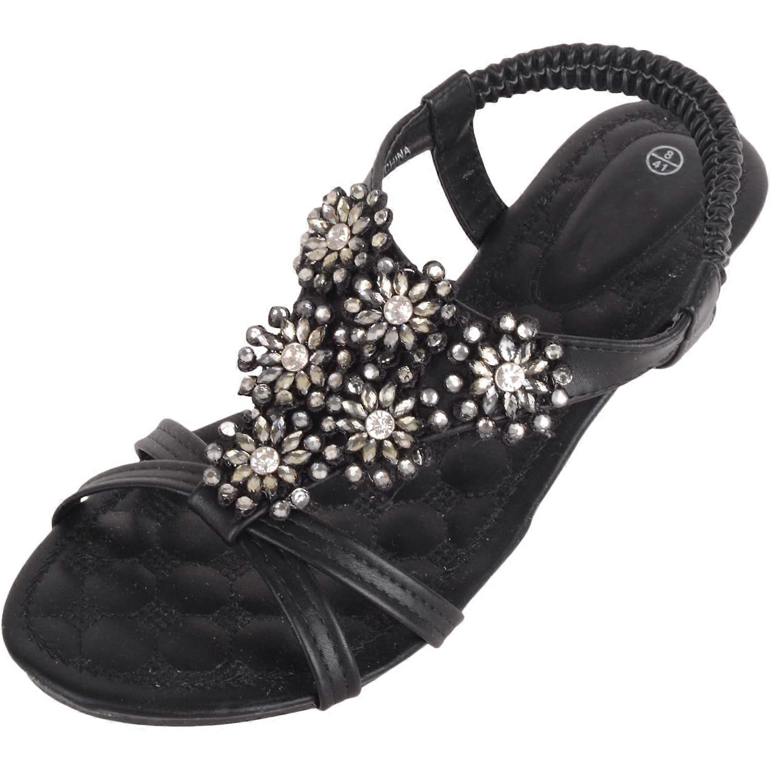Absolute Footwear Womens Mid Wedge Easy Slip On Floral Jewelled Elasticated Sandals
