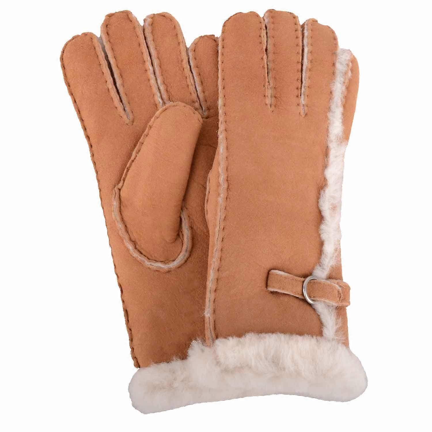 SNUGRUGS Womens Sheepskin Glove with Wool Out and Buckle Detailing. Sizes: Small 6.5", Medium 7", Large 7.5", Extra Large 8". Sheepskin Uppers. Warm Sheepskin Inners . Wool Out and Buckle Detailing