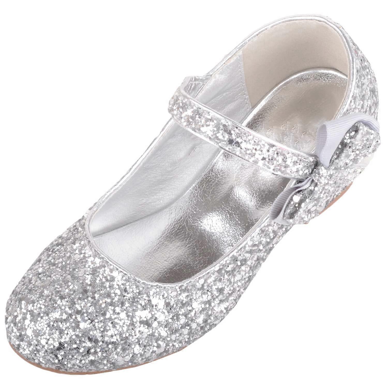 Childrens Kids Glitter Easy Slip On Strap Bow Design Heeled Pumps. Sizes: UK Infant 10 - Child 2. Synthetic Uppers. Synthetic Inners with Comfortable Insole. Hardwearing Durable Sole and Heel for Grip and Comfort. Easy Slip on Stytle with Strap across. Bow Design on Side.