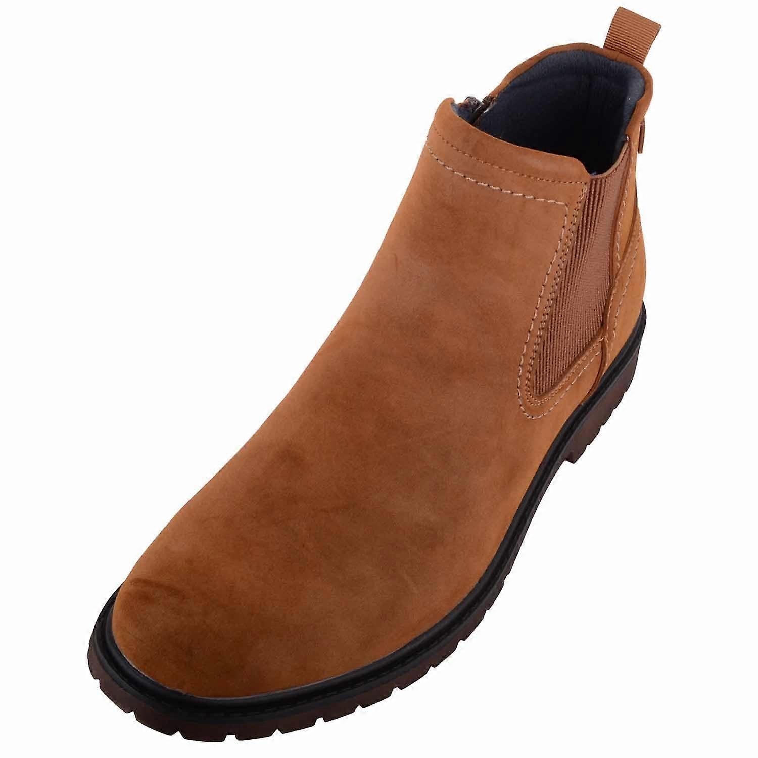 ABSOLUTE FOOTWEAR Mens Easy Slip On Single Gusset Chelsea Desert Boot. Sizes: UK 7 - 12. Soft Faux Suede Uppers with Single Gusset. Synthetic Inners with Padded Insole and Cushioned Ankle Support. Hardwearing Outdoor Ridged Sole. Zip Up Fastening with Pull On Back Tab