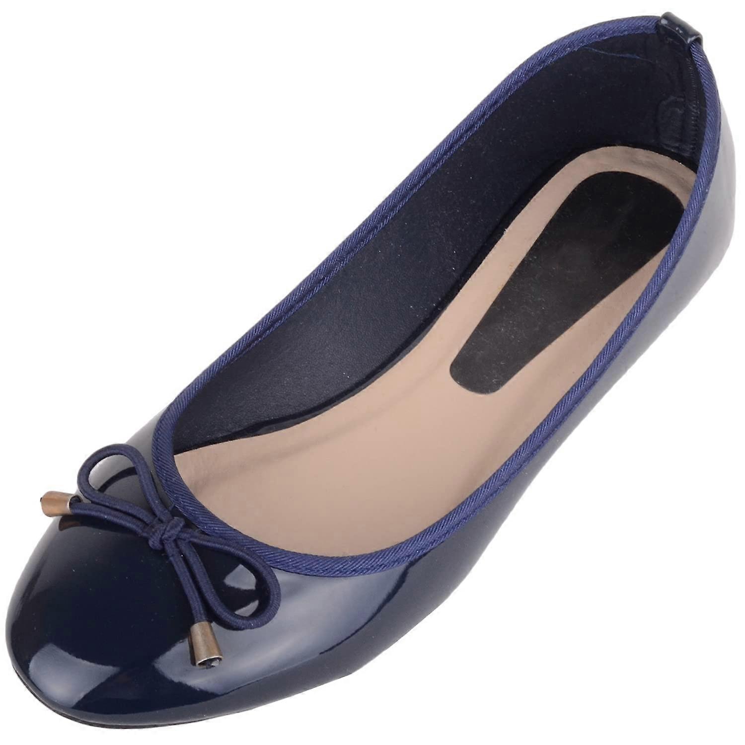 Womens Slip On Faux Patent Leather Smart Casual Work School Ballerina Style Dolly Shoes. Sizes: UK 3 - 8. Patent Faux Leather Uppers. Textile Inners with Padded Insole for Extra Warmth and Comfort. Hardwearing Durable Lightweight Outdoor Sole for Grip and Comfort. Easy Slip On Style. Bow Design on the Front.
