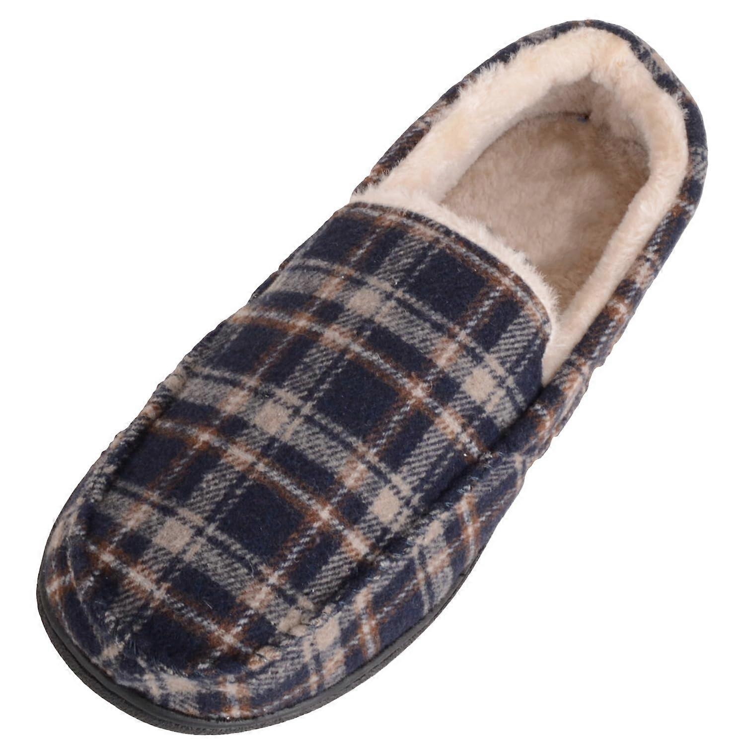 Absolute Footwear Mens Easy Slip On Checked Moccasin Slipper with Fleece Inners