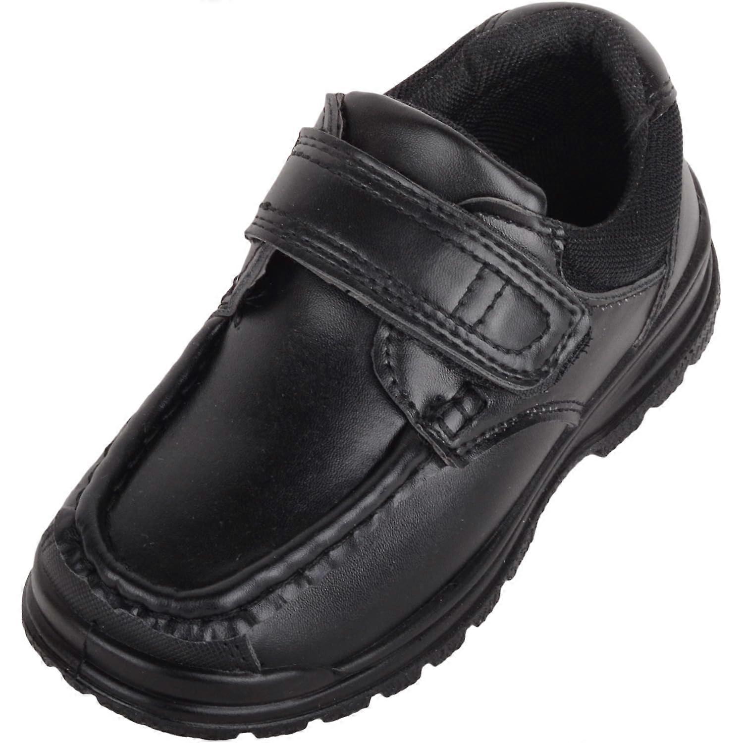 Childrens Kids Faux Leather Easy Slip On Touch and Close Formal Smart School Shoes. Sizes: UK Infant 8 - Child 1. Smooth Faux Leather Uppers. Synthetic Inners with Padded Insole and Cushioned Ankle Support for Extra Comfort. Hardwearing Lightweight Ridged Outdoor Sole for Grip and Comfort. Easy Slip On Style with Touch and Close Fastening for a Secure Fit