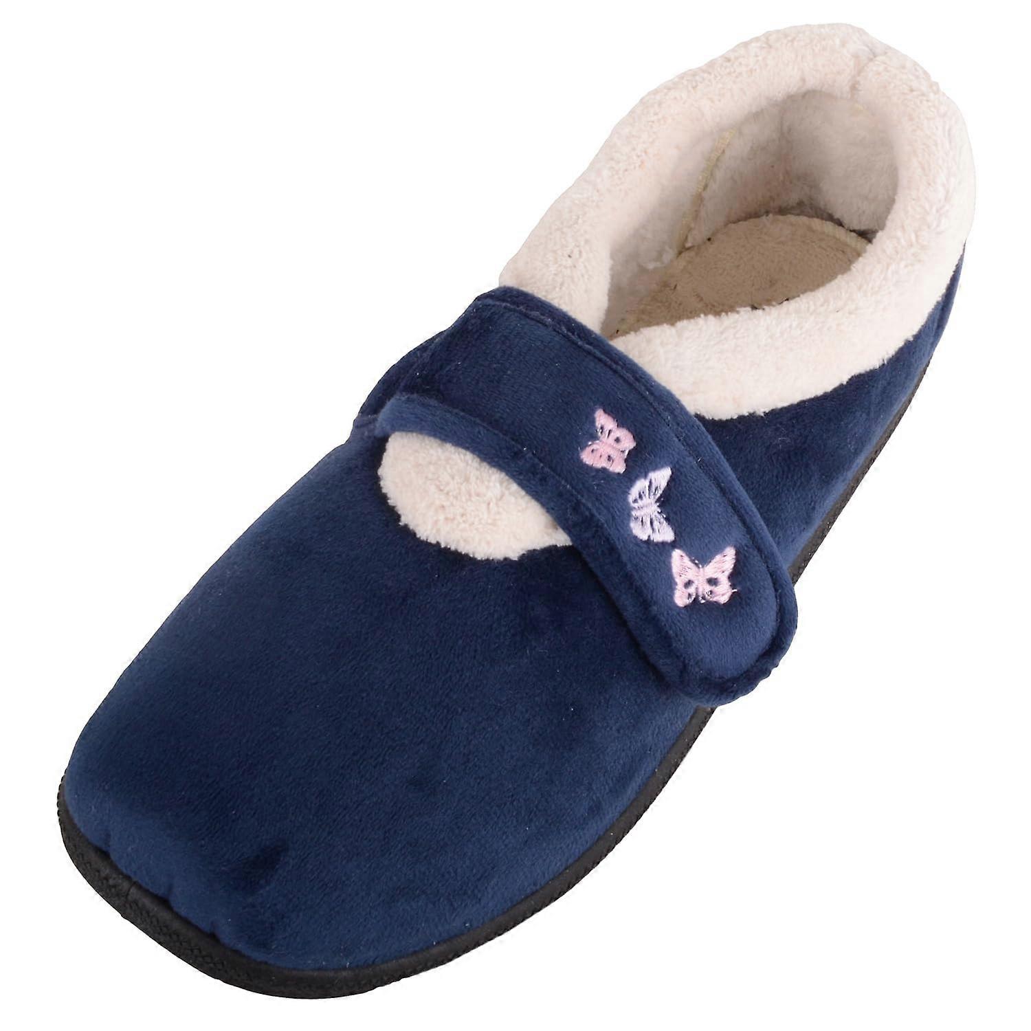 Womens Easy Slip On Wide Fitting Touch and Close Comfort Slipper. Sizes: UK 4 - 8. Smooth Microsuede Uppers with Butterfly Pattern. Soft Fleece Inners with Padded Insole and Collar. Hardwearing Lightweight Flat Sole. Easy Slip On Style with Touch and Close Fastening