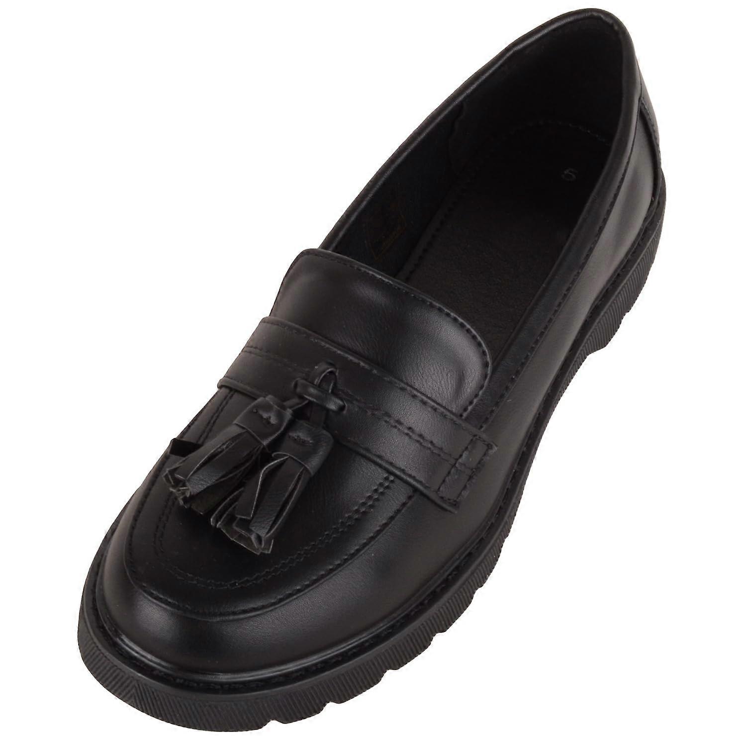 Childrens Juniors Faux Leather Easy Slip On Smart Loafer Shoes with Tassel. Sizes: UK Child 13 - 5. Smooth Faux Leather Uppers. Synthetic Inners with Cushioned Inner. Hardwearing Ridged Outdoor Sole. Easy Slip On Style with Tassel Design