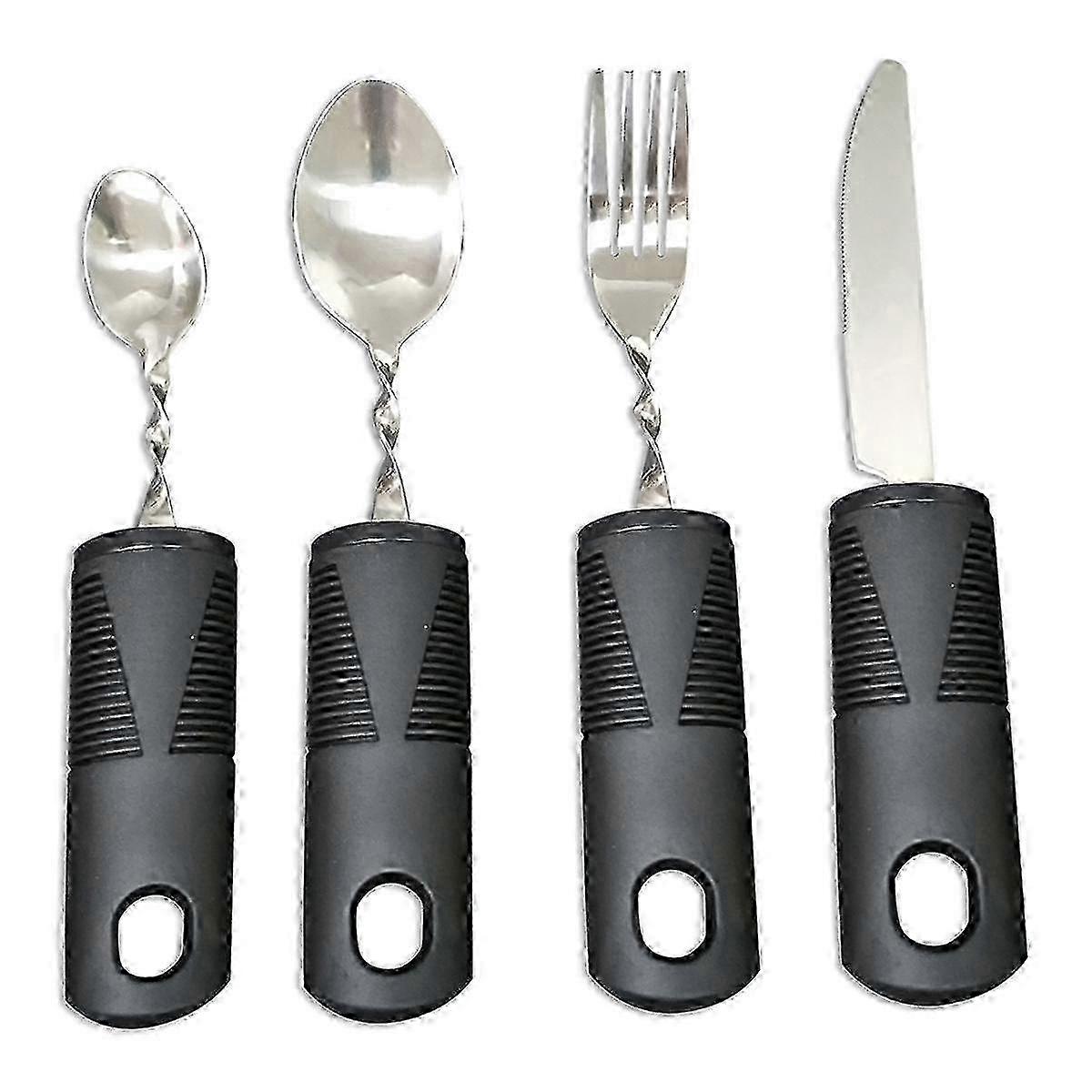 Complete Dining Solution: This 4-piece set includes a tablespoon, teaspoon, rocker knife, and fork, each featuring built-up ergonomic handles. Designed specifically for elderly and disabled individuals, these utensils facilitate ease of use and enhance dining independence. Ergonomically Designed for Struggle-Free Eating: Specifically crafted for those with stiff hands, hand tremors, Parkinsons disease, or limited dexterity. These weighted utensils help stabilize movements, making mealtime less stressful and more enjoyable. Flexible Functional: Our adaptive utensils are bendable up to 180, allowing users to adjust their grip for maximum comfort and effectiveness. This adaptability ensures that our utensils meet the diverse needs and preferences of individuals with mobility challenges. Enhanced Grip, Enhanced Confidence: Each utensil in this set features a bold, heavy handle that not only provides stability but also enhances control during meals. This design minimizes spills and accidents, promoting a more enjoyable eating experience. Show You Care with Specialty Utensils: Offer comfort and functionality to your loved with these weighted, grip-enhanced utensils. Perfect for addressing hand tremors and ensuring individuals can maintain independence and dignity while dining. Note: Slight color difference or differences in kind, does not affect the use of Colour:Black Silver Material:Stainless Steel+PP Package Contents: 4x Adaptive Cutlery Set Only the above package content, other products are not included. Note: Light reflection and different displays may cause the color of the item in the picture a little different from the real thing. :