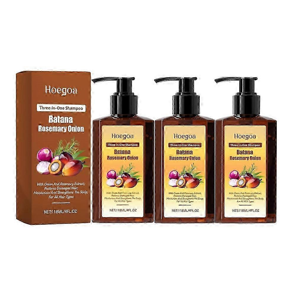 This 3-in-1 shampoo combines Batana, Rosemary, and Onion benefits. - Deeply penetrates hair, repairs damage, strengthens follicles for thicker, fuller, revitalized hair. - Stimulates scalp circulation, reduces hair loss, promotes growth, increases volume. - Gently cleanses scalp and hair, leaves fluffy & elastic, improves texture for easy management. Net content: 118ml per bottle. Ingredients: AQUA, SODIUM LAURETH SULFATE, HYDROXYETHYLCELLULOSE, ELAEIS GUINEENSIS (PALM) OIL, ROSMARINUS OFFICINALIS (ROSEMARY) LEAF OIL, ALLIUM CEPA (ONION) BULB EXTRACT. Usage: Wet hair, take appropriate amount, lather in palms, massage scalp and hair gently, then rinse with water. Packing: 3PCS * 118ml 3-in-1 Shampoo. Color: As shown in the picture.