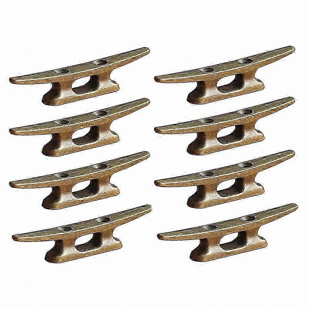 4-inch bollards for securely mounting canoes, kayaks, and other small watercraft on docks. Made of copper-plated zinc alloy for resistance to humidity and corrosion. Suitable for DIY projects. Can be used as towel racks, coat hooks, door handles, curtain hooks, awning hooks, or staircase guardrail accents. Two-hole mounting design for easy installation and material efficiency. High wear resistance and excellent durability. Material: Zinc alloy. Package includes: 8 x boat dock cleats. Screws not included. Color may vary slightly due to screen settings and lighting. Measurement tolerance: ±1–3 cm.