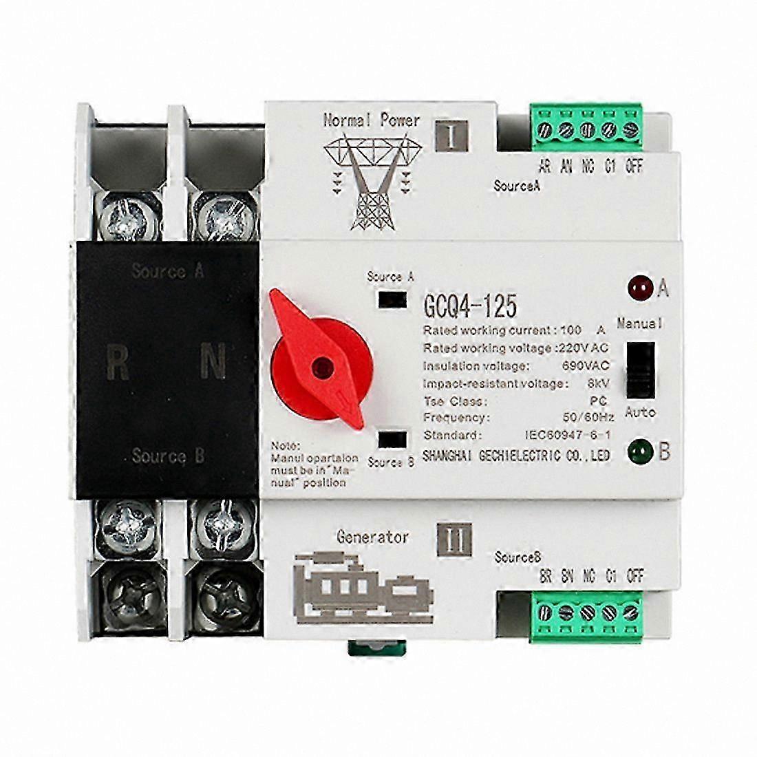 Dual Power Switch. PC Level, No Interruption. The dual-power automatic transfer switch (ATS) is a compact, household-grade power transfer switch, primarily used to monitor and automatically switch between main and backup power sources. When the main power supply fails, the backup power source engages immediately to ensure continuous, reliable, and safe power delivery. Designed specifically for DIN-rail mounting in PZ30 distribution boxes. Suitable for emergency power supply systems operating at AC 50/60 Hz with a rated voltage of 220 V. Features a robust structure, reliable operation, easy installation and maintenance, and long service life. Widely used in locations where power interruptions are unacceptable. Compatible only with utility grid power and generators — not suitable for photovoltaic (PV) systems or inverters. Type: 63A / 100A Dimensions: 107 x 96 x 76 mm Material: PC Plastic Color: White + Black Package Includes: 1 x Automatic Transfer Switch Note: Color may vary slightly due to lighting conditions and screen settings. Measurement tolerance: ±1–3 cm.