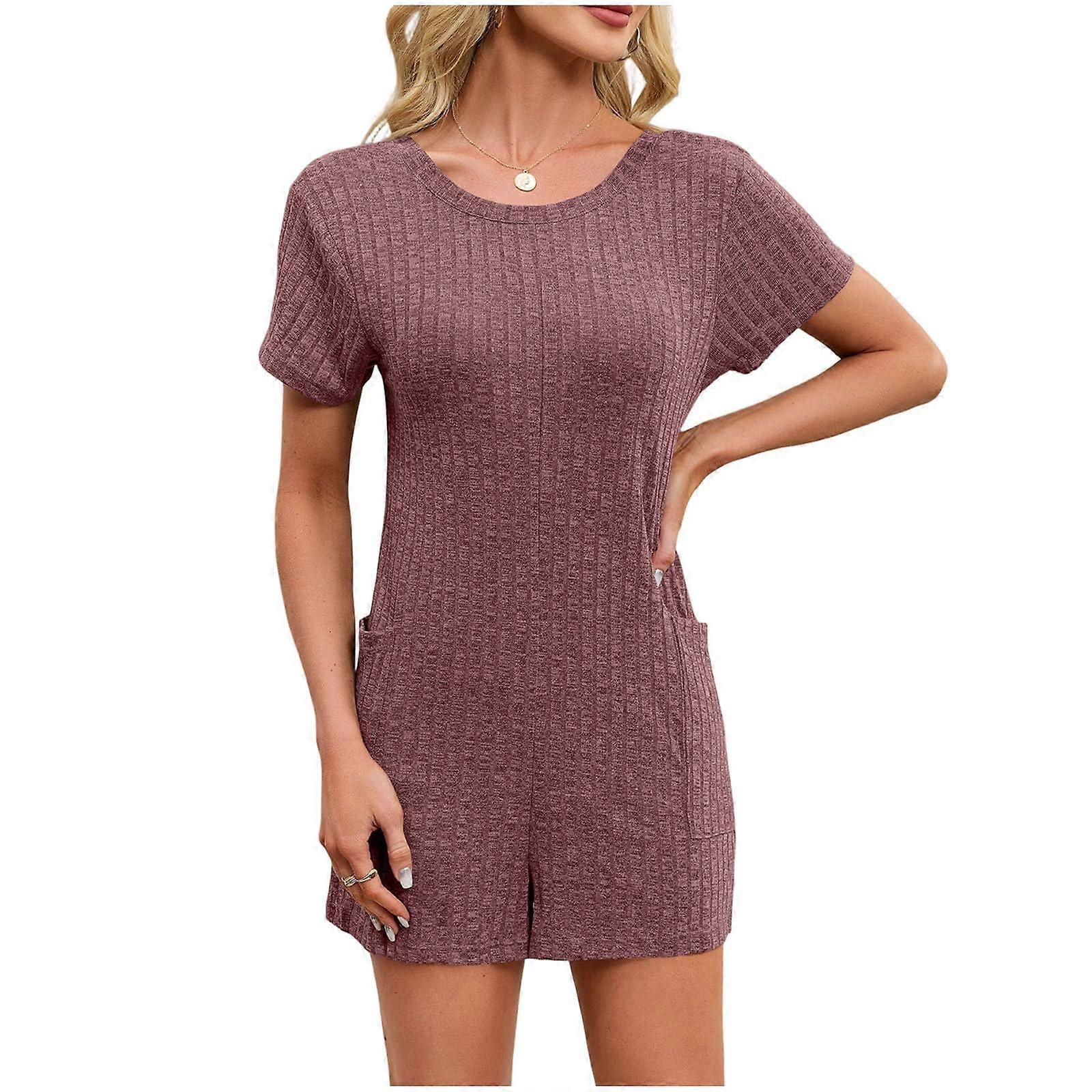 Women Casual Ribbed Short Sleeve T-Shirt Tee Romper Summer Outfits with Pockets Purple XL
