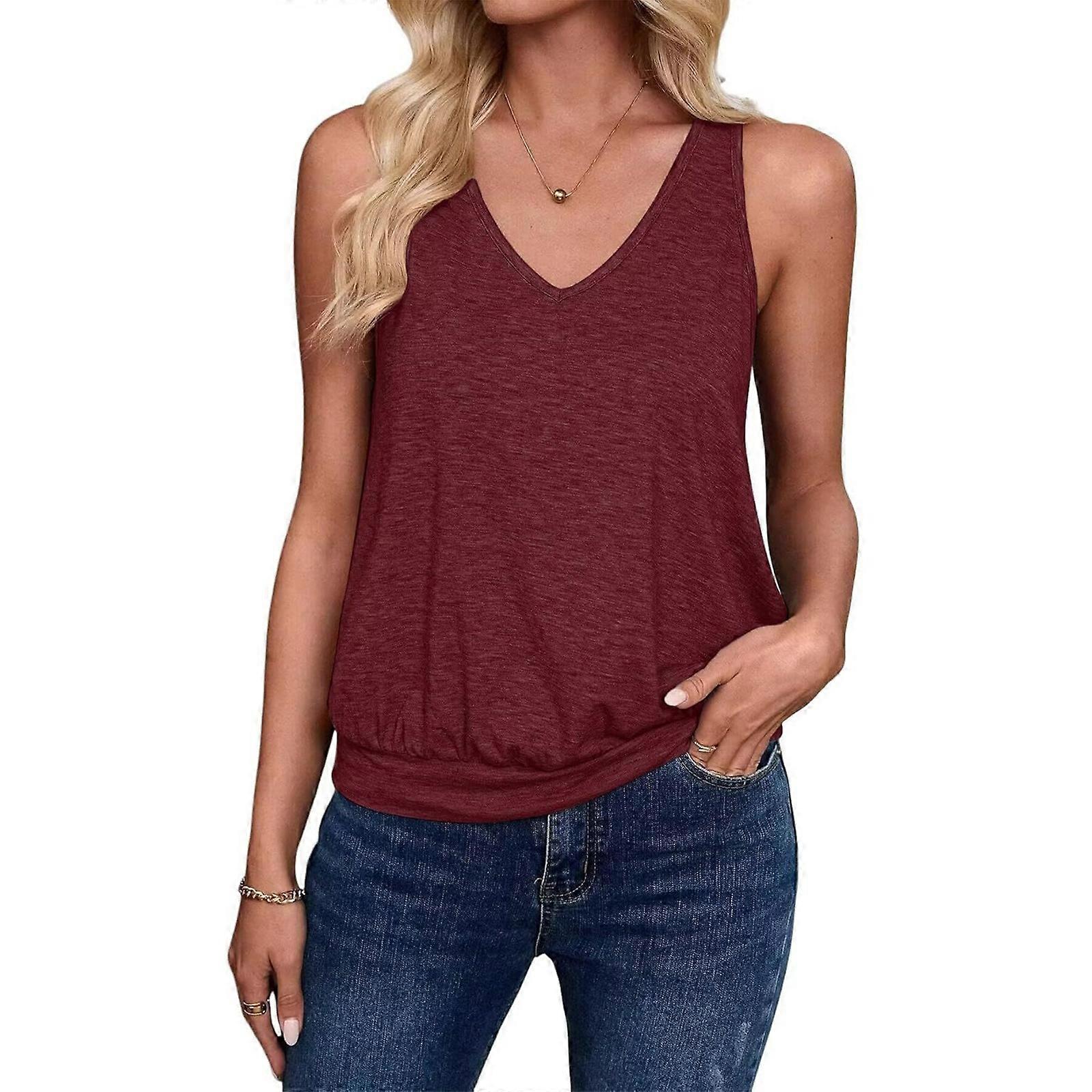 Womens Casual V Neck Spring Beach Vacation Clothes Loose Fit Cute Outfit Fashion Sleeveless Tops Claret XL