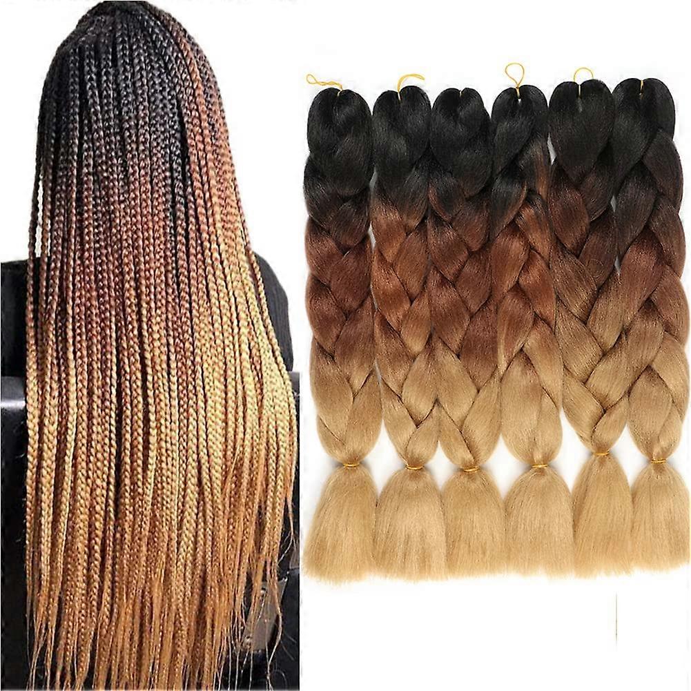 6 Packs 24 Inch Ombre Jumbo Braiding Hair Extensions, Heat Resistant Synthetic Fiber for Full Head Box Braids, Black to Dark Brown to Light Brown