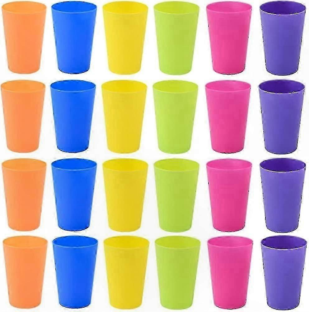 Weight: 0.312 kg Size: 6 x 6 x 8.7 cm Color: Assorted (6 colors: red, orange, yellow, green, blue, purple); 4 pieces per color Reusable: Easy to clean by hand or in the dishwasher; stackable for storage Usage: Suitable as water cups, juice cups, beer cups, coffee cups, or mouthwash cups; ideal for parties, barbecues, birthdays, camping, home, office, and classroom use