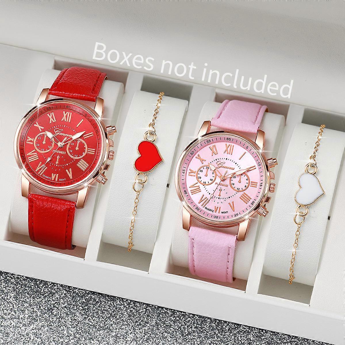 4PCS Fashion Women Watches Simple Roma Dial Quartz Watch Ladies Leather Band Wristwatches Heart Bracelets Set(Without Box)