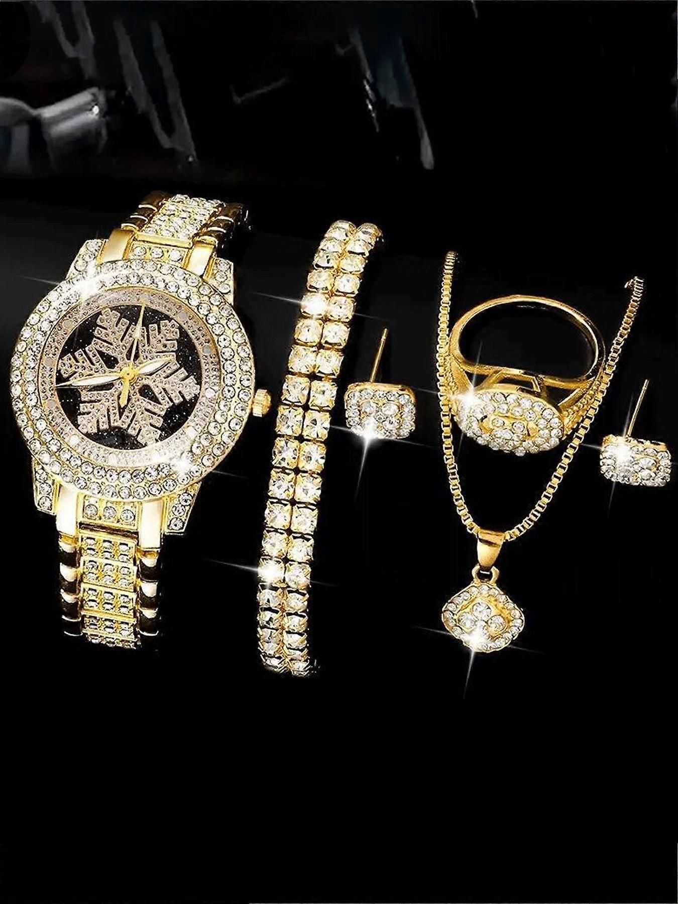 6-piece set of Starry Sky Steel Belt with Diamond Snowflake Women's Watch Fashion Full Diamond Women's Quartz Watch Set