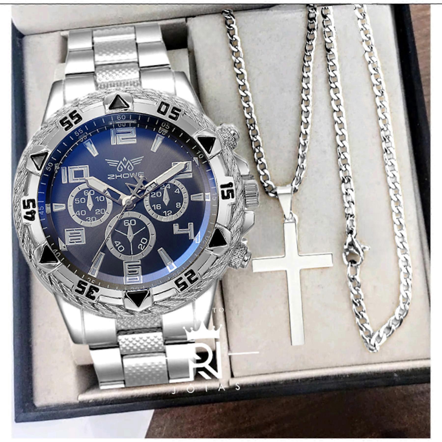 Men's Watch Set + Necklace with Cross Fashion Casual Stainless Steel Three-dial Quartz Watch Fathers Day Graduation Gift Set