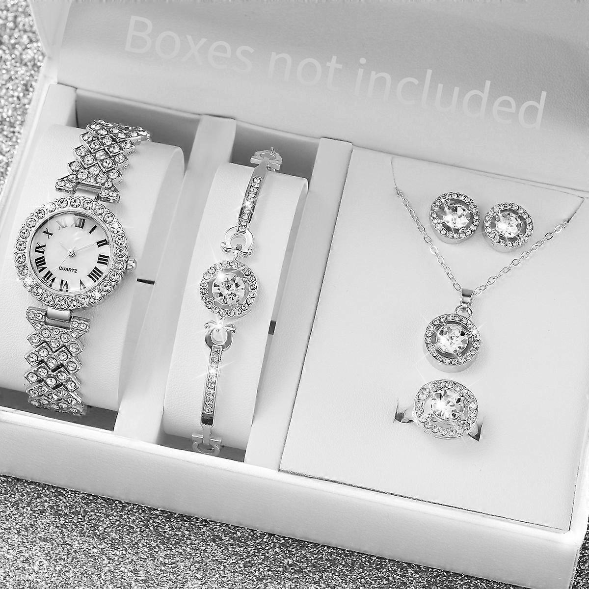 6PCS/Set Luxury Rhinestone Women's Watch Silver Band Ladies Roma Dial Quartz Watch Jewelry Set(Without Box)