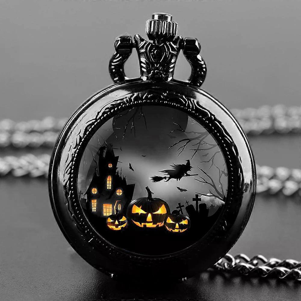 Pumpkin Witch Glass Dome Quartz Pocket Watch With Durable Chain Arabic Numeral Dial Halloween Gifts for Kids