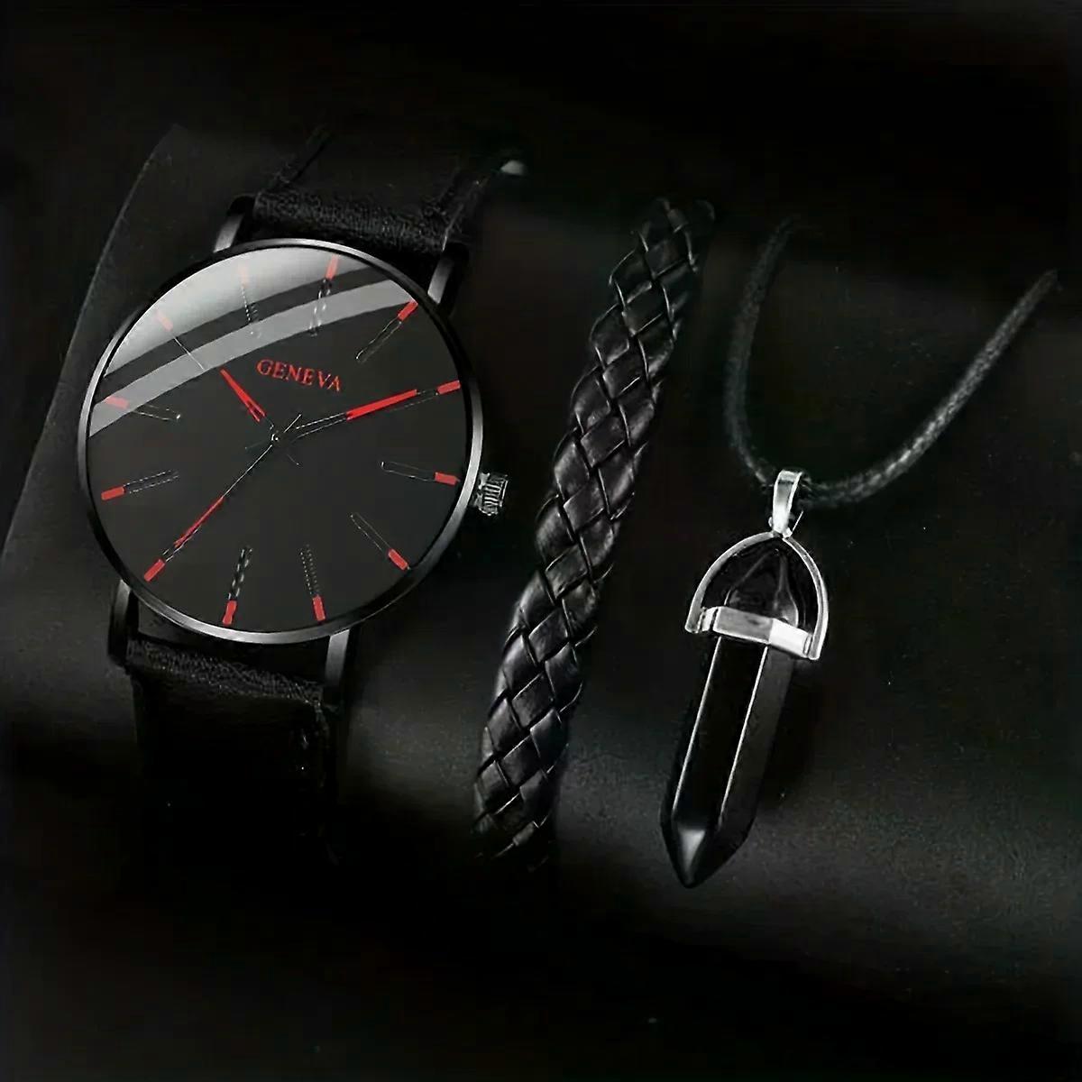 3pcs/set 1 Round Men's Quartz Watch And 1 Bracelet 1 Necklace
