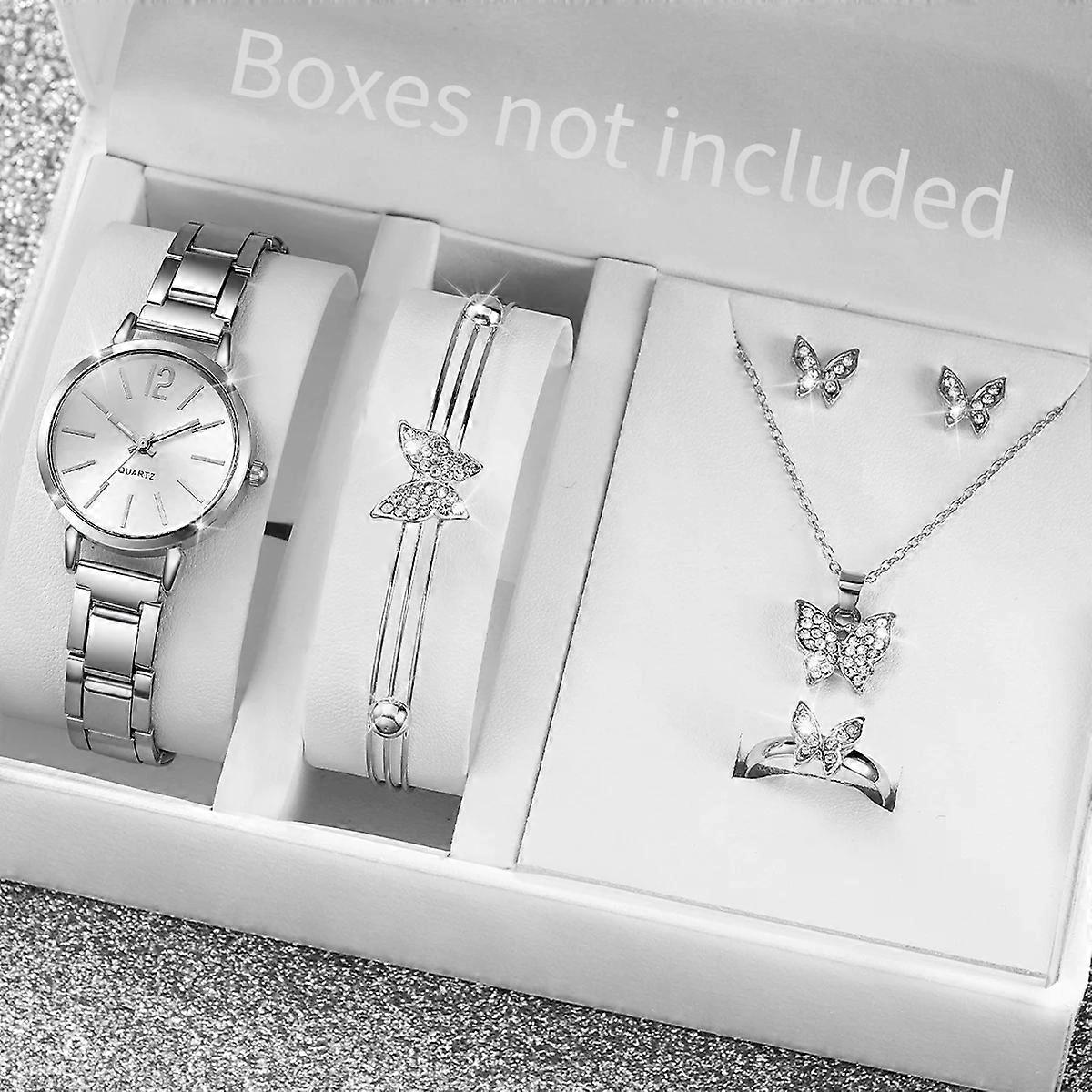 Women's Quartz Watch, 6 Pieces, Silver Steel Bracelet, Butterfly Jewelry Set (Without Box)