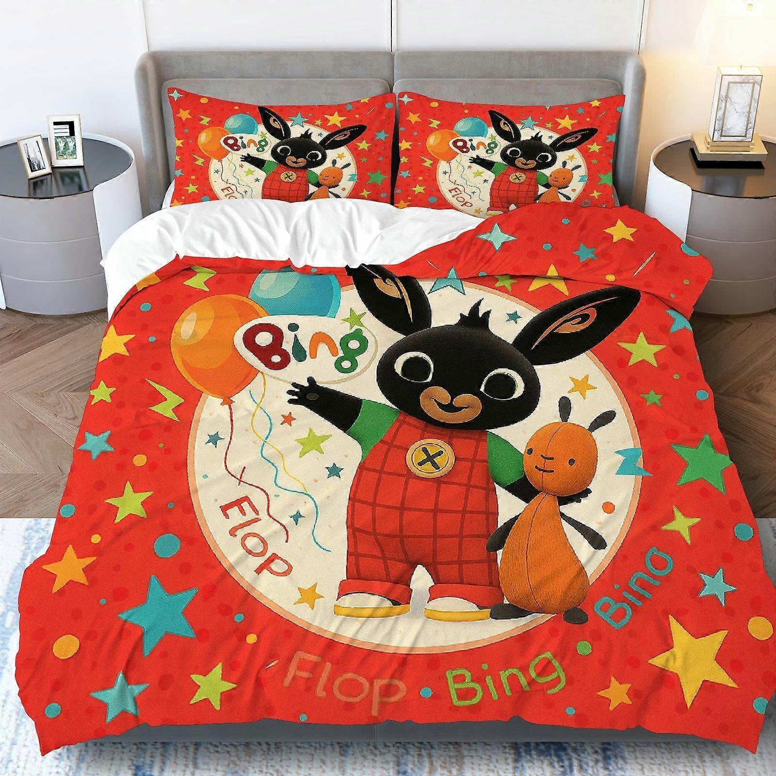 3pcs Bing Bunny Bedding Set - Vibrant Red Yellow Star Pattern Duvet Cover with 2 Pillowcases Zipper Closure Machine Washable Polyester