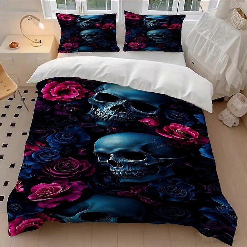 3pcs Gothic Skulls Roses Duvet Cover Set - Soft All-Season Bedding with Zipper Closure Dark Pink Floral Design