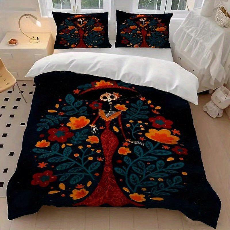3pcs Floral Skeleton Lady Duvet Cover Set - Breathable All-Season Bedding Suitable for All Seasons
