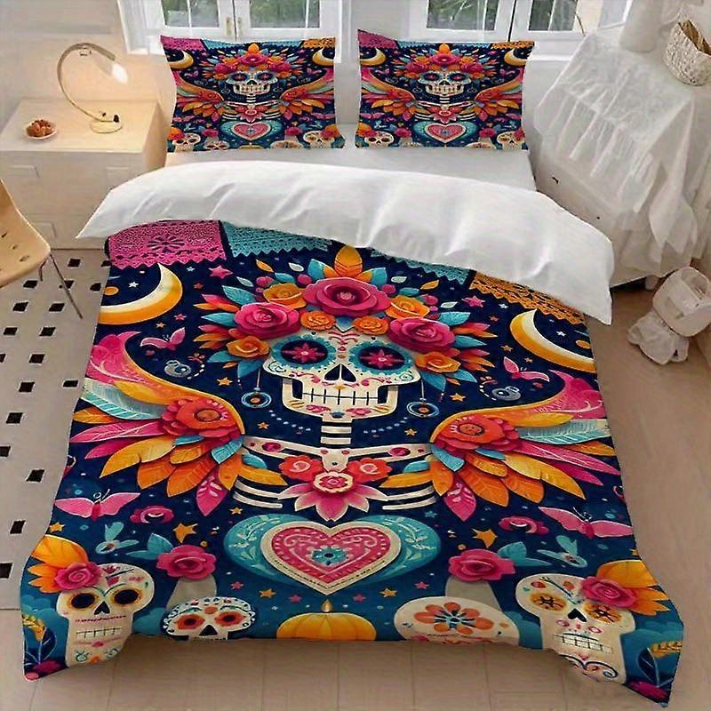3pcs Winged Sugar Skull Duvet Cover Set - Machine Washable Polyester Includes Duvet Cover And Pillowcases