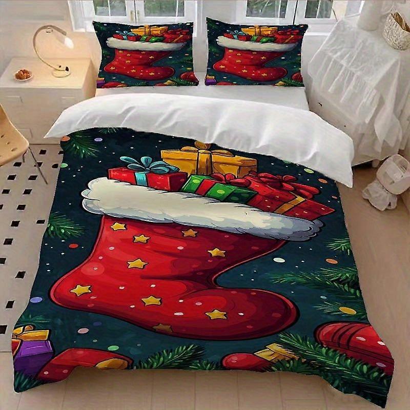 3pcs Christmas Stocking Gifts Duvet Cover Set - Breathable Warm Bedding Set Vibrant Red Green Holiday Design with Santa Hats Presents