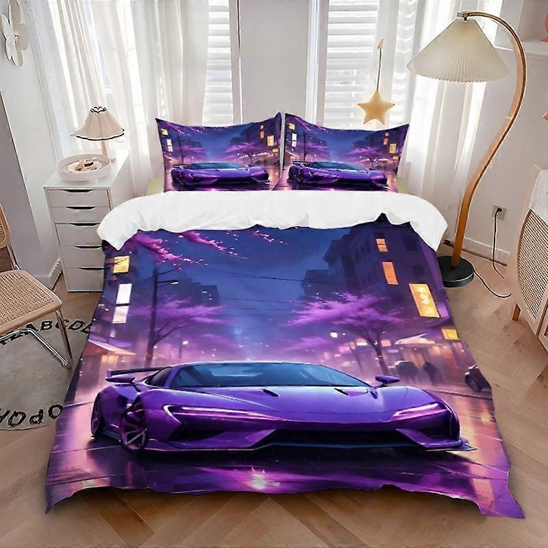 3pcs Futuristic Car Cover Set - Vibrant Purple Sports Car Design Durable Polyester Bedding with Zipper Closure