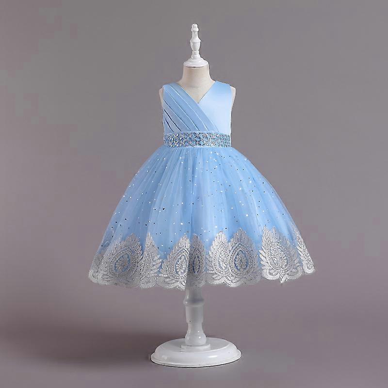 Girls Skirt Lace Trim Beaded Waistband Kids Sleeveless V - Neck Satin Spliced Dress Sequined Tulle Children Elegant Party Dress