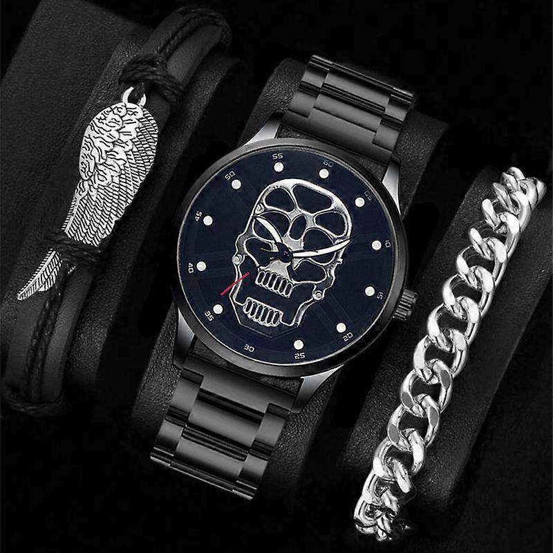 3-piece set of fashionable large dial cool skull trendy men's wristwatch business dark style quartz watch set