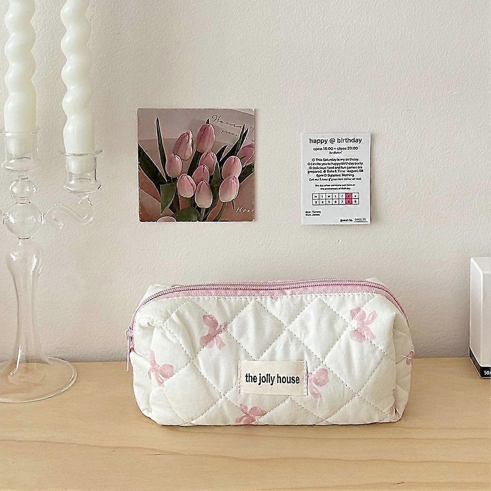 Cute Bow Toiletry Bag with Zipper Makeup Organizer Storage Bag Cotton Quilted Cosmetic Organizer Case for Women and Girls