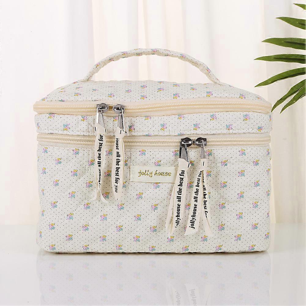 Double Layer Travel Makeup Bag Large Capacity Cotton Quilted Makeup Bag with Compartments Floral Zipper Closure for Women Girls