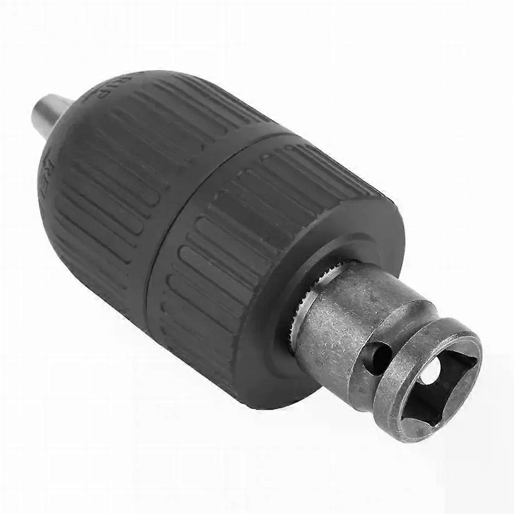 Drill Chuck With 1/2inch Chuck Socket Square Female Adapter 1/2-20UNF Quick Grip Keyless Chuck 2mm~13mm(008~051) Clamp Range Feature: [Keyless Feature]: keyless drill chuck turn to tighten or loosen with ease. [Durable Design]: Ergonomic and strong design with full metal sleeves in black oxide finish that eliminates the possibility of rust. [Material]: Carbide jaw-inserts reduce bit slippage and enhance wear resistance. [Feature]: With through hole for clockwise and anticlockwise rotation. [Application]: This medium duty steel keyless drill chuck is a versatile product that fits almost every brand drill motor. Compatible with cordless and portable drills. Specification: 2-13mm Drill Chuck: Connection Size:1/2-20UNF; Clamp Range:2 ~ 13mm / 0.04 ~ 0.51inch . Compatible Devices:Electric screwdriver, Electric drill, Hammer drill, Electric hammer, Impact wrench Note: The actual product color may deviate from the photo due to light.There may be a slight deviation in the measurement of product. _x000D_ _x000D_