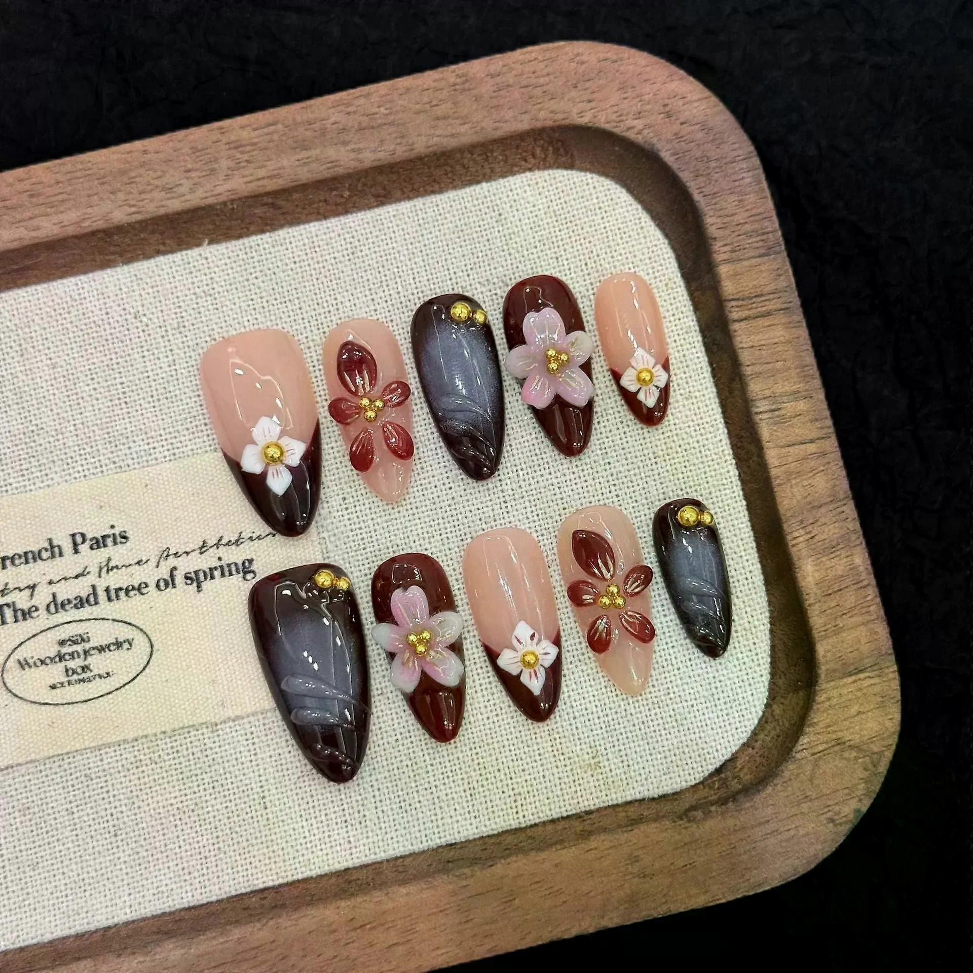 10pcs Handmade Press On Nails Almond False Nails Pearl 3D Flower Decor Red French Fake Y2K Nails Fashion Flash Glitter Nail Art Package Includes: 1 Set * False nails (10pcs included) 10PCS * Jelly glue 1 * Nail rub strip