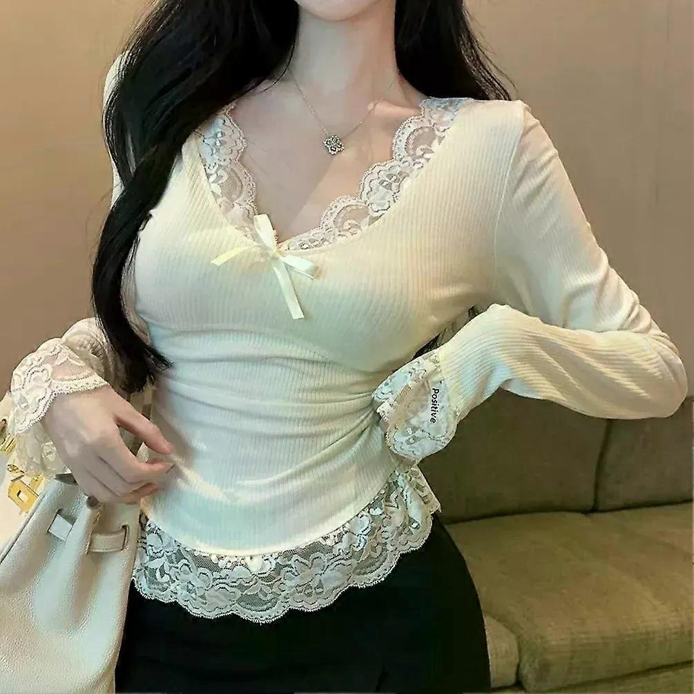 Women s Autumn/Winter New Style Long Sleeve T-Shirt Pure Desire Slims Lace Decorated V-Neck Top Polyester Fiber Base Layer