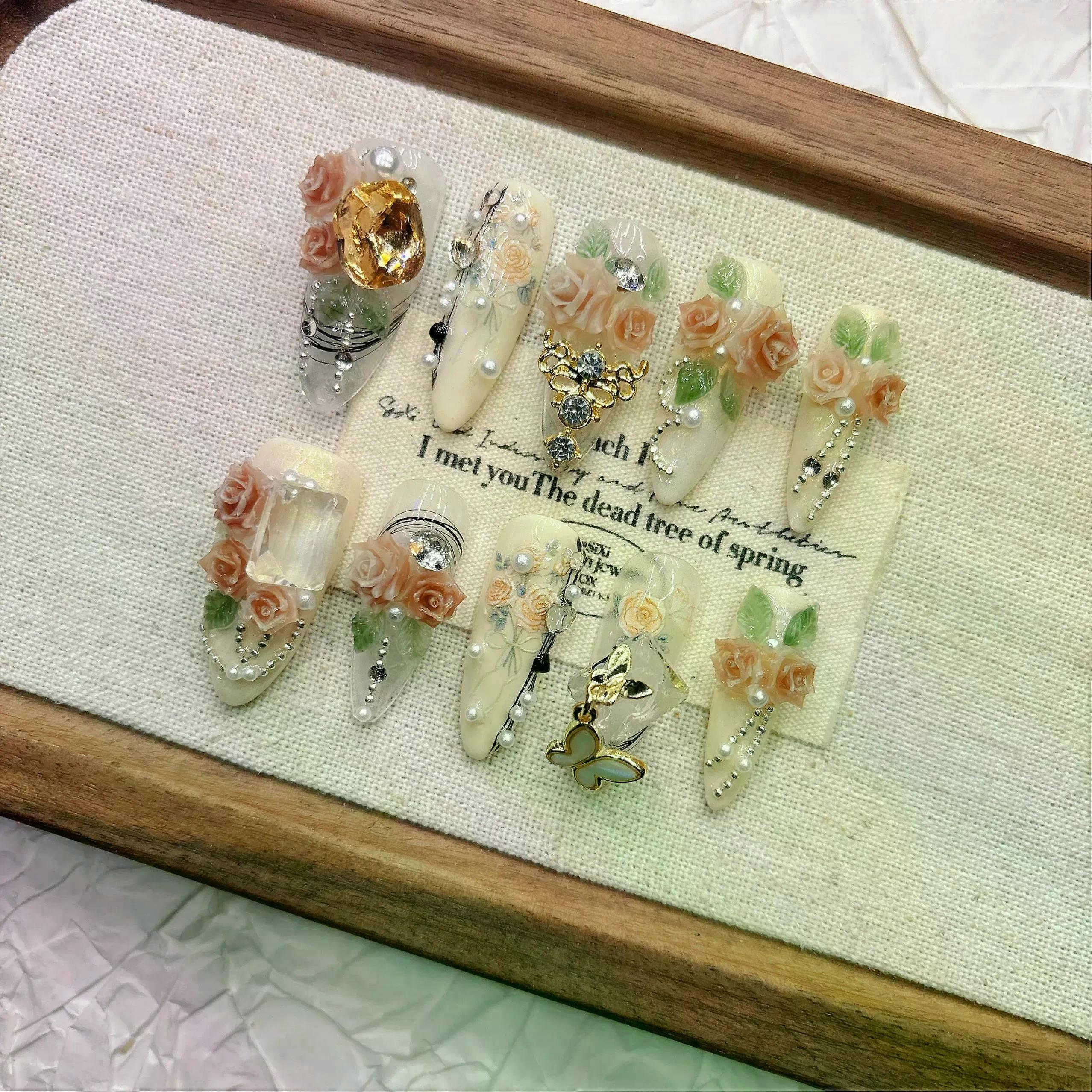 Spring Rose Nail Art Elegant Floral False Nails with Pearl Rhinestone Leaf Decor for Wedding Dating Party Daily Wear