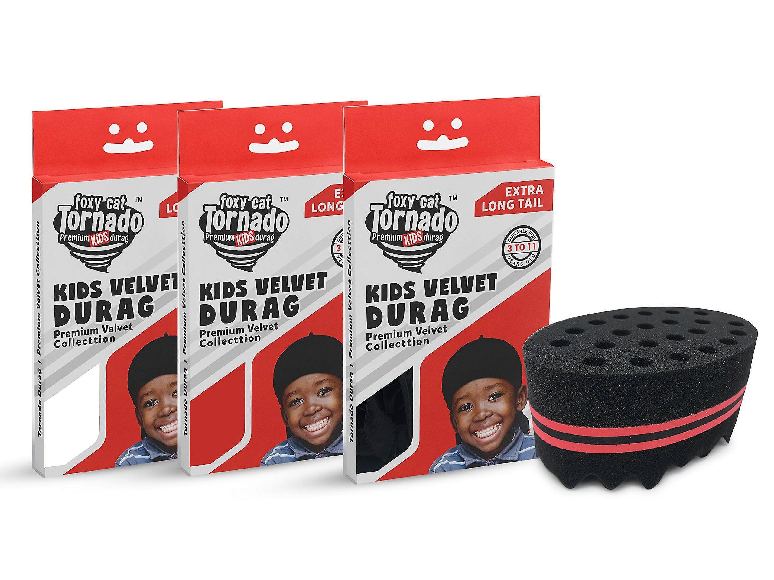 Soft, stretchy velvet durag set designed for kids, offering comfortable fit and reliable hold for waves, twists, and cornrowed styles. Each cap features an extralong tail and wide straps to provide even compression and a secure wrap. Includes three colors and a medium twosided twist sponge for styling. Key benefits Comfortable fit: Stretchy velvet cap with a shaped design that sits flat and reduces bulk. Strong hold and compression: Extralong tail and wide straps allow for tighter, more even compression to maintain styles. Versatile styling: Ideal for creating and preserving waves, securing cornrows, and holding twists or braids in place. Included styling tool: Medium twosided twist sponge helps define twists and textured styles. Colors and count: Set of 3 kids velvet durags in Black, White, and Red. Attributes Material: Soft velvet for gentle contact with hair and scalp. Size and fit: Designed for kids, with long straps to wrap securely and adjust to fit. Performance: Provides consistent compression for daily wear, sleep, or poststyling hold. Compatibility: Suitable for use on a range of hair types when forming waves, cornrows, twists, or braid styles. Practical use scenarios Overnight wave setting: Use after brushing and apply the durag to set waves overnight for smoother, more consistent results in the morning. Postbraid or postcornrow protection: Wear during the day or at night to keep braids and cornrows neat and reduce friction. Styling and maintenance: Use the medium twosided sponge to create defined twists, then secure with the durag for longerlasting definition. A straightforward, practical set for kids who need reliable compression, comfort, and easy styling support for waves and braided looks.