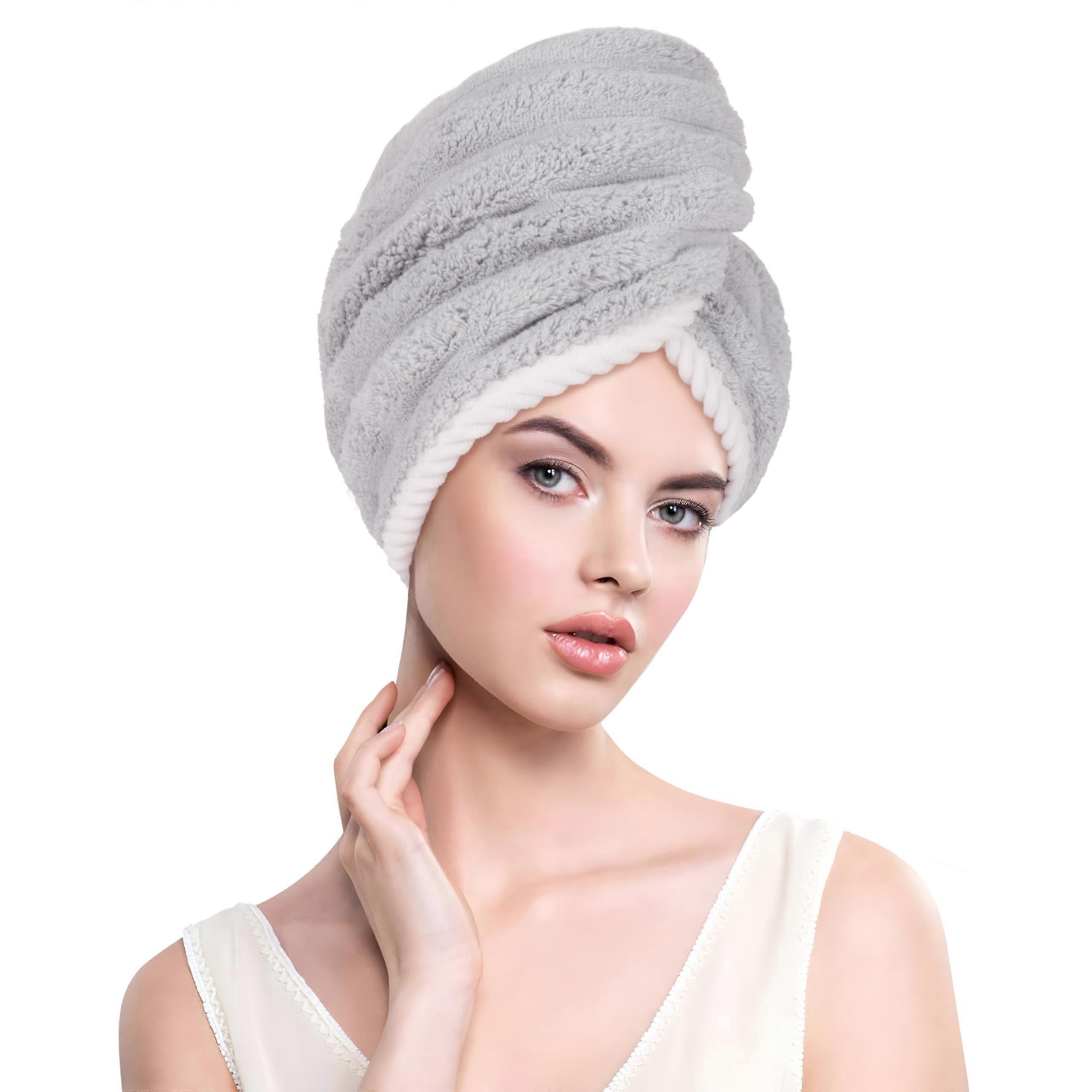 Hair Towel Wrap with Button, Super Absorbent Quick Dry Microfiber Turban for Curly Long Thick Hair, Grey