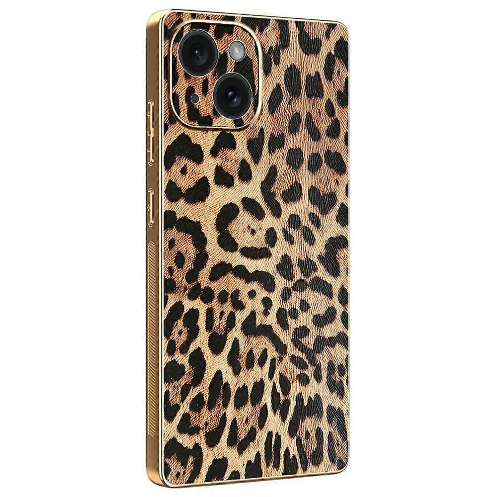 Compatible For iPhone 15 Case Leopard Print PU Leather Coated PC + TPU Electroplating Phone Cover