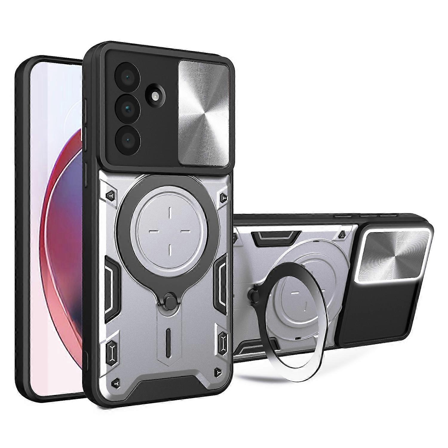 •【Support Magnetic Car Mount】 Built-in iron sheet ensures stable attachment to magnetic car mounts, providing secure holding even on bumpy roads. •【360 Degree Rotating Kickstand Design】 Adjustable rotating ring supports multiple viewing angles, allowing hands-free use for navigation, video watching, or video calls anytime, anywhere. •【Full-Frame Anti-Drop Protection】 Reinforced TPU + PC structure with shock-absorbing corners delivers instant rebound and impact resistance to reduce damage from accidental drops. •【Sliding Lens Cover Protection】 Integrated sliding camera cover fully protects the lenses from scratches, dust, and impacts, while also enhancing privacy when not in use. •【Rugged Mechanical Style】 Industrial-inspired design with metal-texture accents adds a tough, modern look while improving grip and everyday durability. Compatible with: •Galaxy A26 5G Package included: •1 x Phone Case •Other items not included
