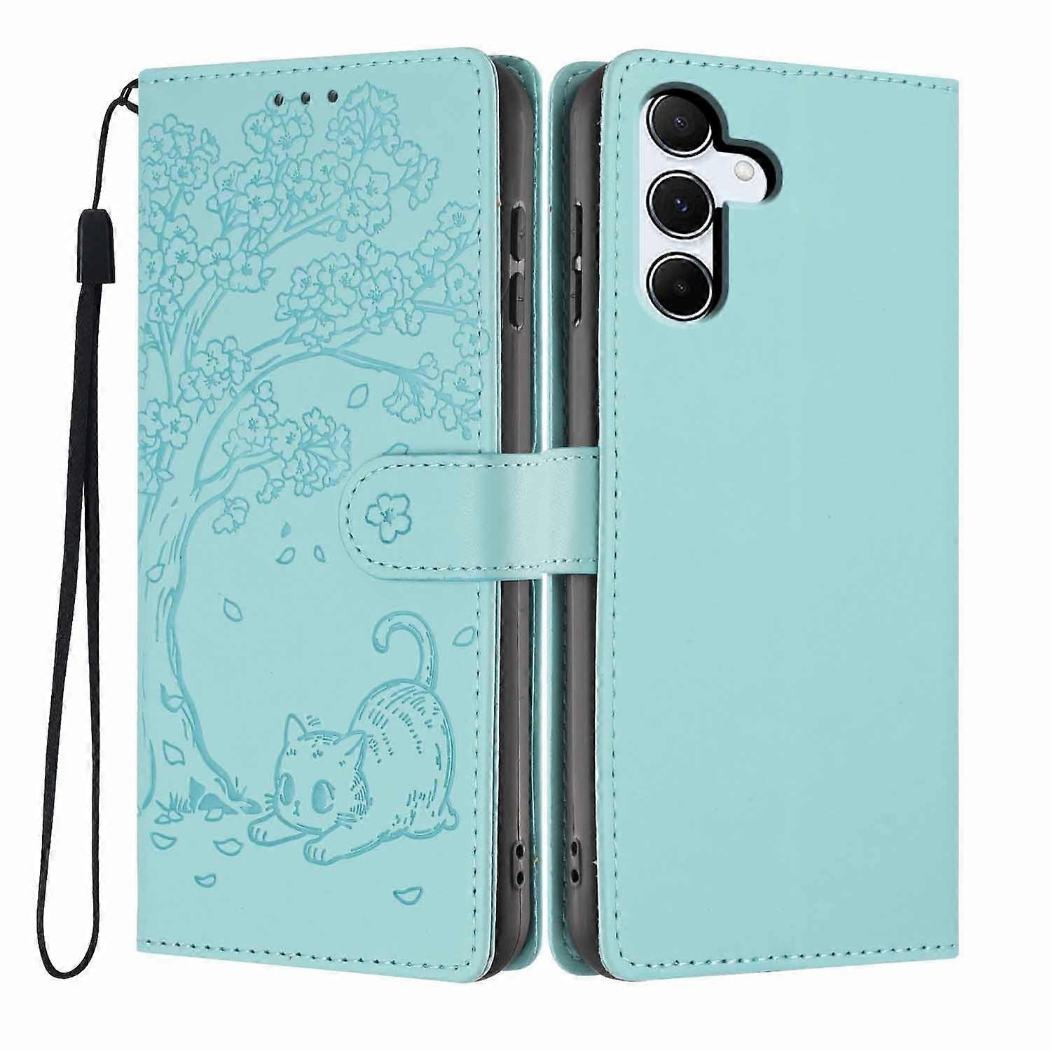 For Samsung Galaxy A55 5G Stand Case Tree-and-Cat Pattern PU Leather Wallet Protective Phone Cover w
