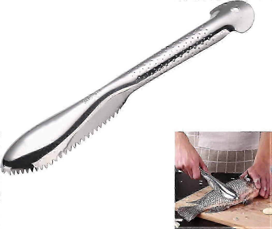 Fish Scale Scraper 304 Stainless Steel Fish Scaler Remove Fish Scales Fish Knife Scraper (28.5*4cm) High-quality material: The product is made of food-grade 304 stainless steel. The product material is guaranteed and safe to use. No risk of cutting hands: Using this fish scaler, removing fish scales will not cut your hands, and there is no risk of hurting yourself with fish scales, which is much better than using a knife. Ergonomic design: It is comfortable to hold and use, with labor-saving grip and no slipping. There is also a hook ring at the end of the handle, which can be easily hung on the kitchen shelf. Faster fish scale removal: The serrated fish scaler can remove fish scales very quickly. Convenient scale removal: Unlike using a knife, the fish scale brush allows you to remove fish scales easily and quickly.