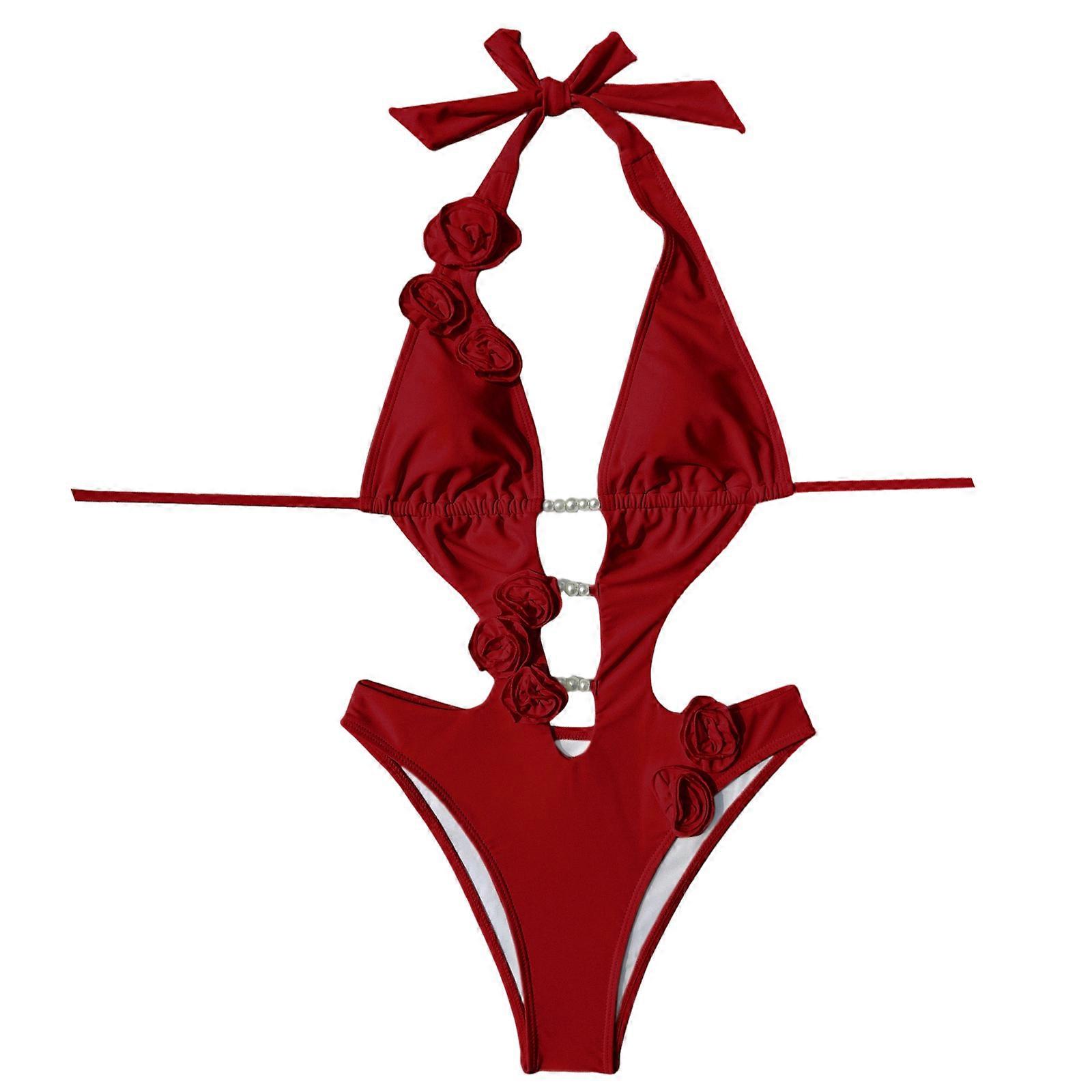Women Plunging V Neck Monokini Bathing Suit Flower Pearls Piece Swimsuit Backless Halterneck Swimwears for Surfing Red S