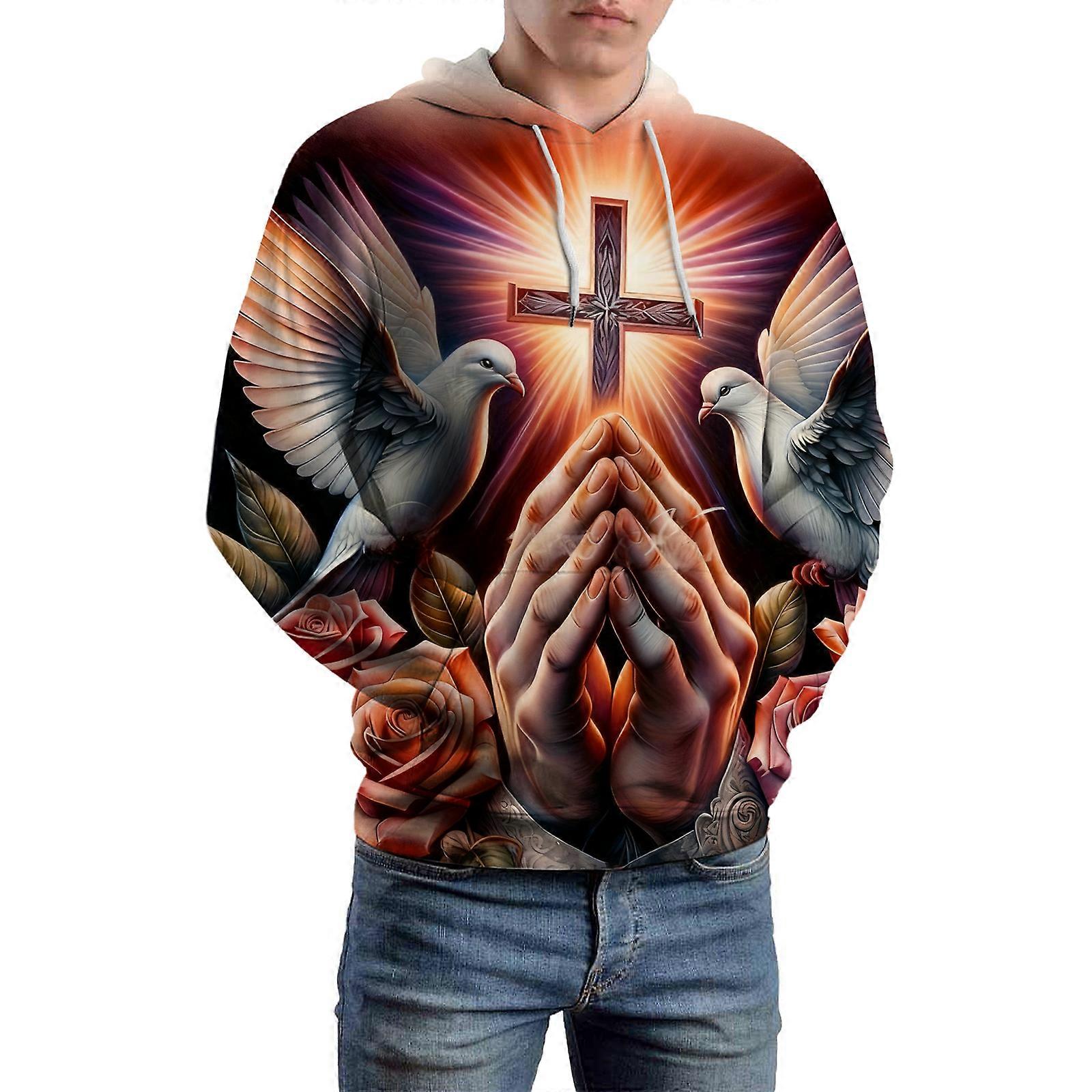 Men's Praying Hands And Cross Graphic Hoodie Soft Art Print Pullover Casual Statement Top