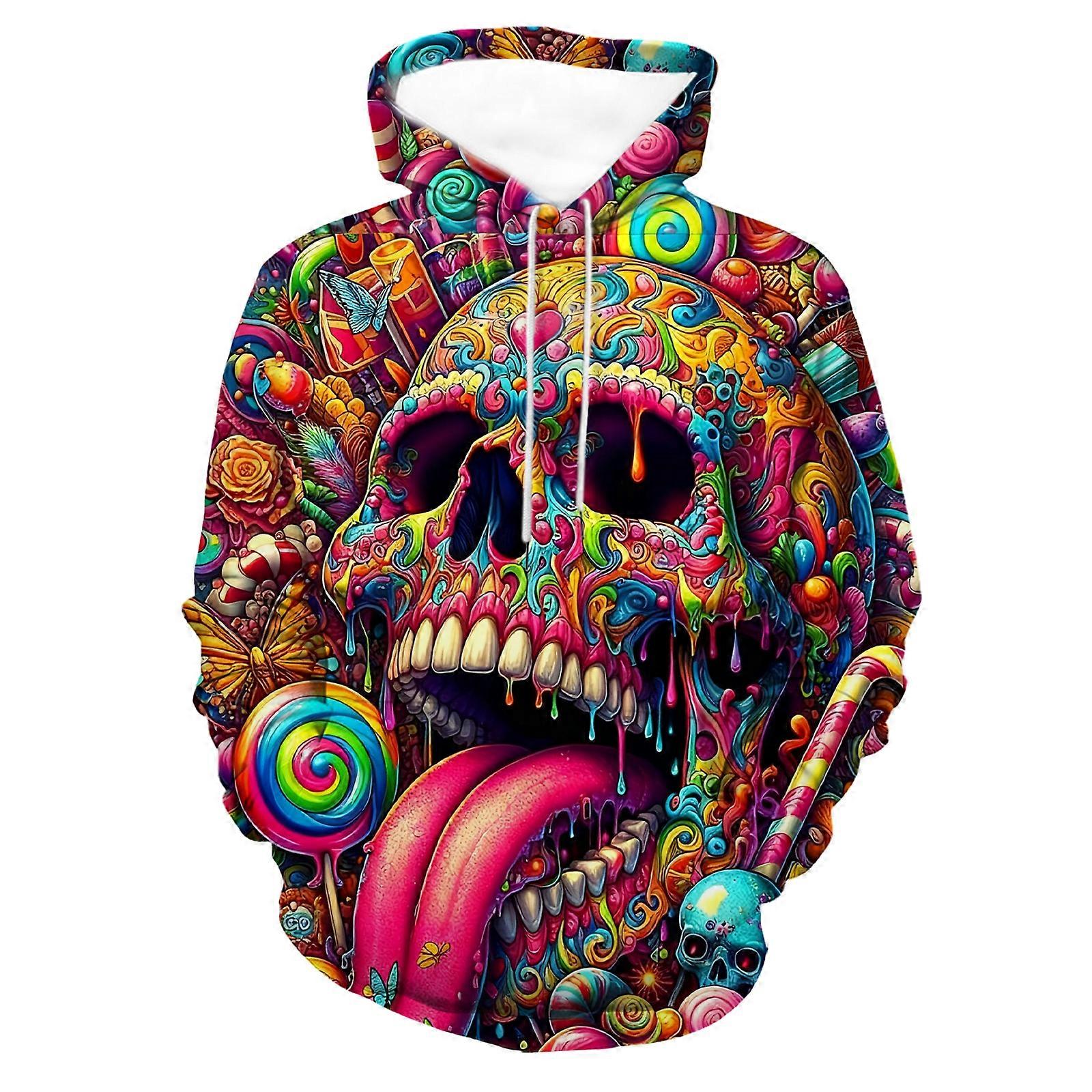 Men's Colorful Skull Graphic 3D Hoodie Vibrant Art Print Pullover Edgy Casual Top
